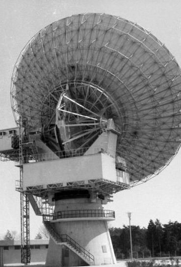 昭和42年12月に完成した茨城第2アンテナの仰角回転構造部の建設風景と完成後 の写真です。クレーンで重い構造物を吊り上げて組み立てていくわけですが、 少しの狂いもなく組み立てられ非常に壮観な風景でした。 茨城第2アンテナは直径27.5メートルのホーンリフレクター給電カセグレンアン テナで、世界初のインテルサット標準地球局の規定を満足したアン テナでし た。 アポロ宇宙船による月着陸の実況TV中継で活躍し、現役を退いたあとは海 外研修生の実習設備として使用されましたが、新アンテナ建設のために平成2年 に取り壊されました。