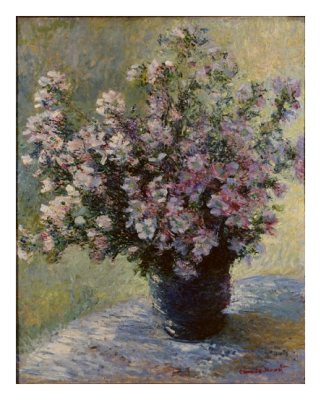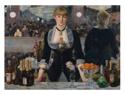 私の目を引いた作品のひとつはモネ「花瓶の花」(1881-1882)。華やかでみずみずしく、淡々しい桃色で統一されていて愛くるしい可憐な姿に引き寄せられました。水色のテーブルと藍色の花瓶との配色も絶妙、和室にも似合いそうな雰囲気ですね。場を引き立て和ませてくれることでしょう。 マネ「フォリー=ベルジュールのバー」の前では、黒山の人だかりの中、時間を忘れて立ち尽くしていました。何かを語りかけてくるようなあるいは注文を待ち受けているかのような謎めいた表情の売り子、テーブルの上の琥珀色やロゼ色のアルコールが透けて見える魅惑的な数々の瓶、マネのサインが刻まれた左端のボトル、フルーツ皿に盛られたリアル感たっぷりのオレンジ、背後の観客の紳士淑女たちのざわめき…。この絵との対峙と会話が醸しだしてくれた異国情緒満載の世界はそれはそれは素敵なエキゾチックな空間でした。 少女の両腕の長さがちぐはぐであったり鏡に映る少女の背中の位置が不正確であったりと、観る者の注意喚起と想像を呼び起こすアンバランスの構図はマネの遊び心でしょうか、この絵の楽しみのひとつにもなっています。左上の空中ブランコの両足にはドキリとさせられますね。 “マネ最晩年の傑作”のタイトルにふさわしい、期待に応える一枚の絵でした。