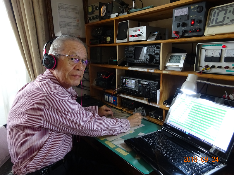以前使用していたアンテナタワーでなく、また、大型アンテナでなく、ワイアーアンテナ(ダイポールアンテナ)のみで勝負をしています。それ故、特に過疎地町村との交信は至難です。交信の95%はモールス符号によるものですが、最近はインターネットや携帯電話の影響からか、ハム人口も1/3程度まで減少したことや、ましてモールス符号による交信が激減しています。今はパソコンによる送信でなく、健康を考慮して、すべて指先を使う手送り送信ですが、声を出す電話の交信も健康に良いのではと考えております。