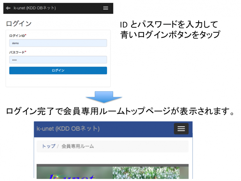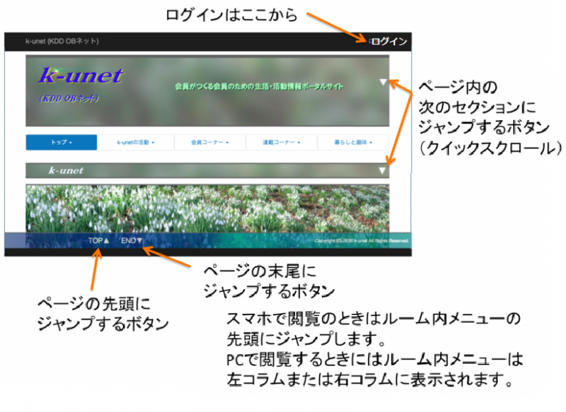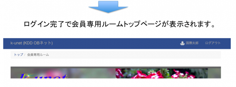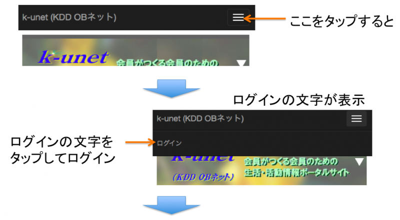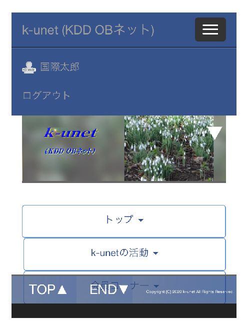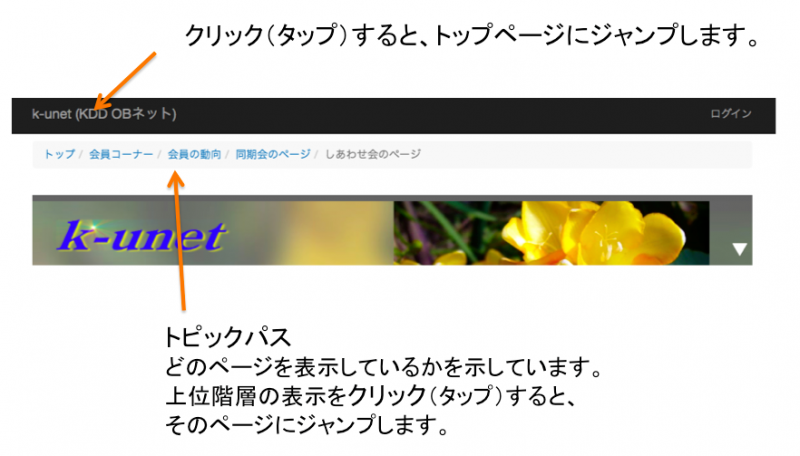 トップバーのk-unet(KDD OBネット)の文字をクリック(タップ)するとトップページにジャンプします。