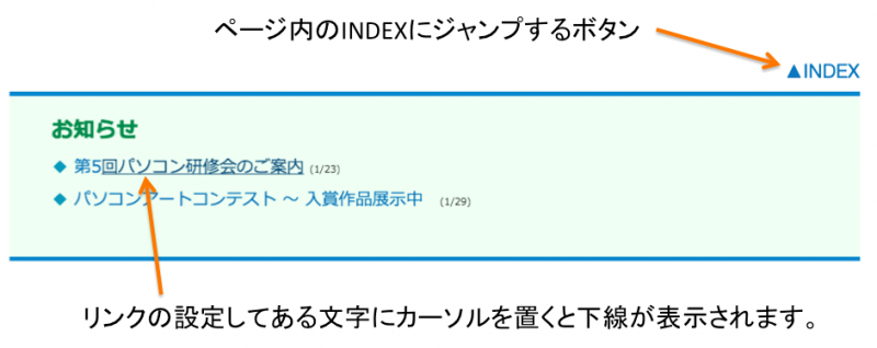 ページ内には、ページ内ジャンプや他ページに移動するためのボタンやリンクが設定されています。クリック(タップ)することで、該当箇所にジャンプします。下図をご覧ください。
